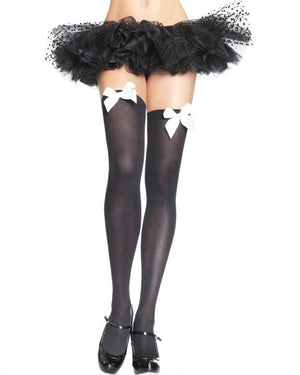 Add the perfect finishing touch to any costume with these Black Opaque Thigh High Stockings with White Satin Bow. From maids to vampires and everything in between, these thigh highs are a versatile accessory for your next fancy dress costume.