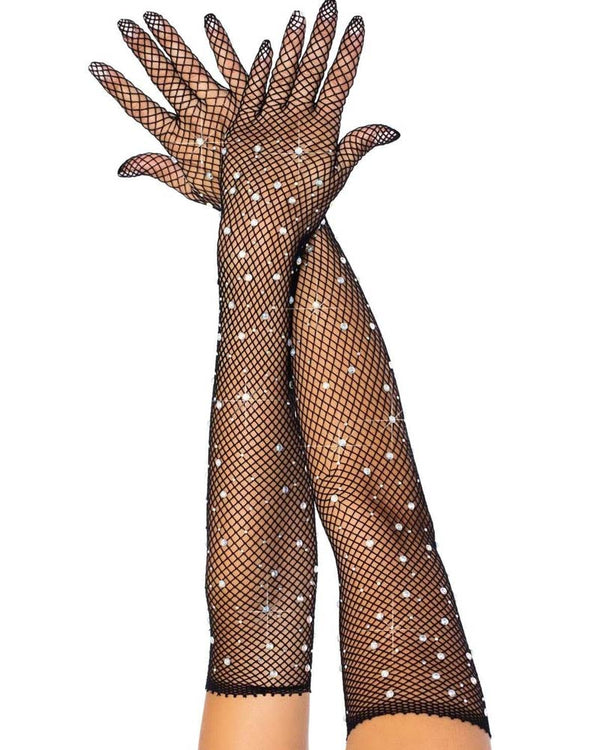Give your costume a touch of sparkle and finish it off with a pair of these Black Rhinestone Fishnet Opera Length Gloves. These black fishnet gloves are made from stretchy nylon and feature sparkling silver rhinestone accents covering the entire gloves. These gloves sit from your hands to your biceps. Great for a large number of costumes or for some added glam to your festival outfit.