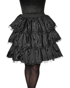 Whatever the look, this Black Ruffle Skirt is sure to add an air of allure to your costume this Halloween! This black mid-length skirt features three ruffled layers with lace accents and an elasticated waist for added comfort. Perfect for witch costumes, just don't get lost on your way to the Wicked West!