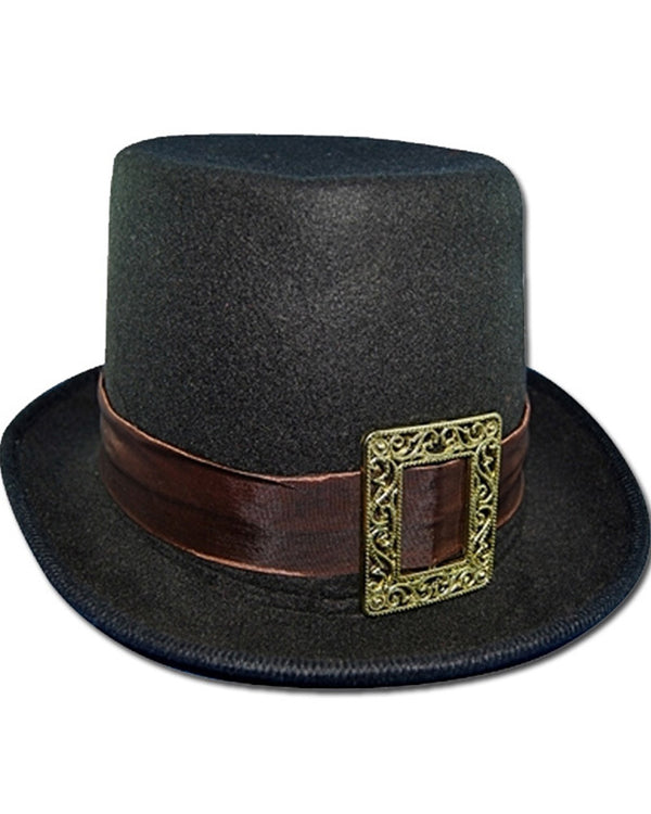 Complete your steampunk or Victorian-era costume with this Black Steampunk Top Hat with Buckle. Made from black feltex this top hat features a brown ribbon wrapped around the base with a large gold rectangle buckle attached at the front. Pair this top hat with our other steampunk or Victorian accessories to complete your character.