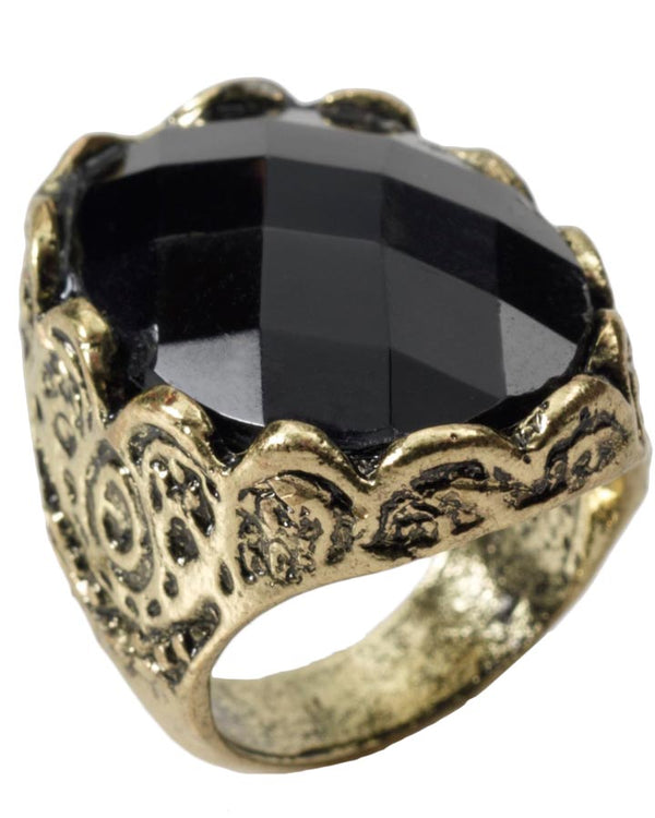Add this dramatic Black Stone Royal Ring to your regal costume and play the part! Large black facetted ring set in a filigree gold coloured metal. Perfect for medieval kings and queens.