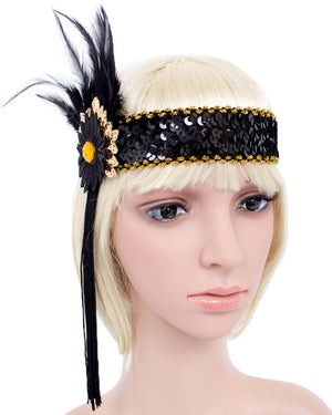This Black Tassel Feather Headband is an essential accessory for any flapper costume. The headband is covered in black sequins with gold trim and an applique flower with a gold jewel in the centre. A black tassel is attached to the flower which is surrounded by gold sequins with black feathers attached to the top. A great addition to any flapper costume for your next 1920's party.