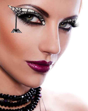 Get in the spirit of Halloween with this Black Widow Eyes Kit. This kit features white adhesive eye pieces with web detailing and a black spider that dangles down the cheek, white glitter goo, eyelashes and eyelash glue.