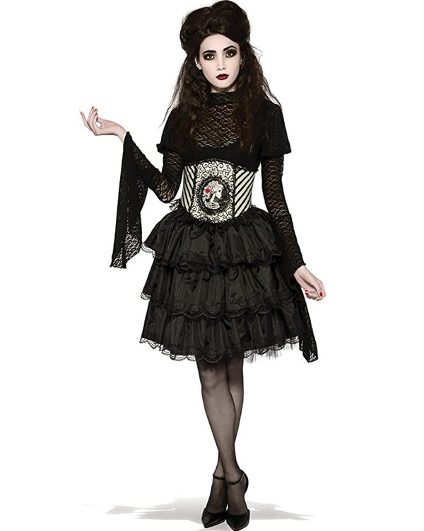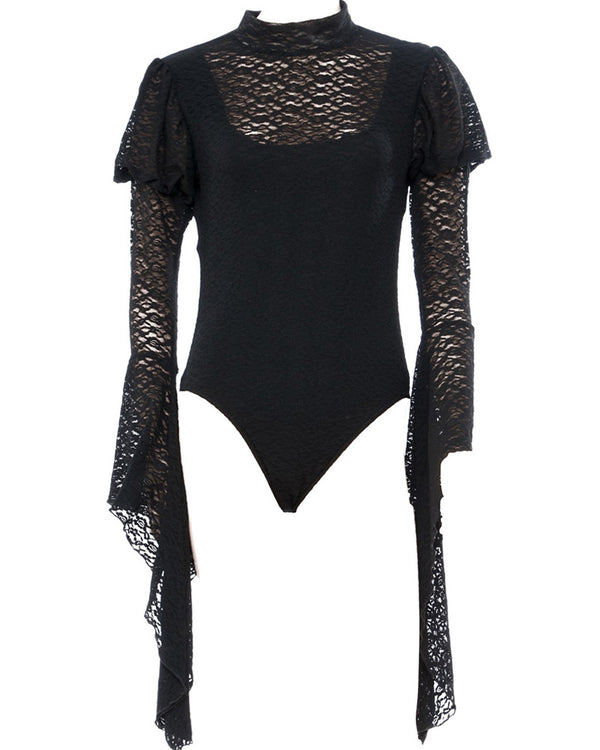 Add an air of gothic glamour to your costume this Halloween with this Blackout Bodysuit! This black bodysuit is made with lace and features a high neckline and long bell sleeves. Perfect with witch, Addams family and gothic costumes!