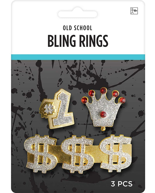 Bling up your outfit wearing our 90s Bling Gold Rings. These flashy rings come in a pack of 3. Pack includes gold and silver ring in the shape of #1. Rock the silver glitter crown ring with red jewels for that royalty vibe. And for the ultimate boss status, the long gold ring featuring three silver dollar signs will have everyone knowing you're all about that money. Perfect for any 90s gangster or pimp costume.
