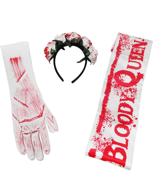 Add this Bloody Queen Ladies Headband Gloves and Sash Set to your dead prom Queen costume for the ultimate Halloween costume. The set comes with white gloves with blood smears, a white flower headband with bloodied petals and a white sash that reads "Bloody Queen" in red with blood splatter around it.