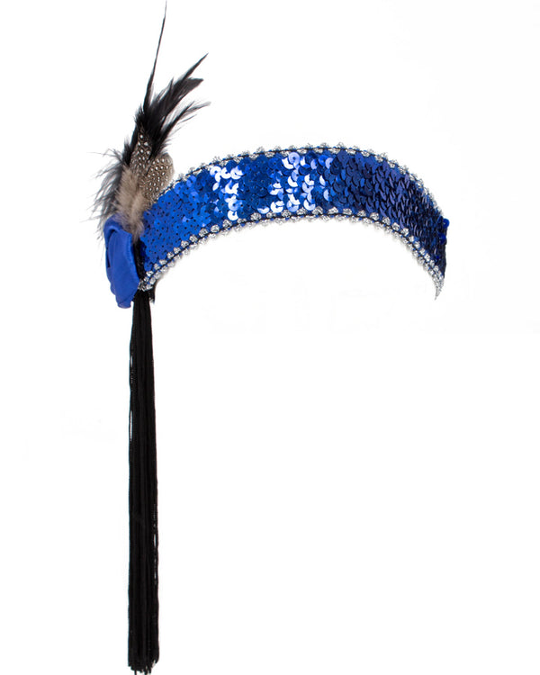 Complete your 1920's look with this glamorous Blue Flower and Black Tassle Flapper Headband. The perfect finishing touch for your roaring twenties look. Made with sparkly blue sequins, black feathers and tassle with a royal blue rosette style flower on the side. Fabulous Daaarling...