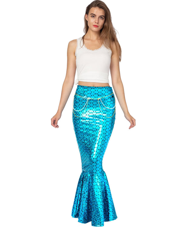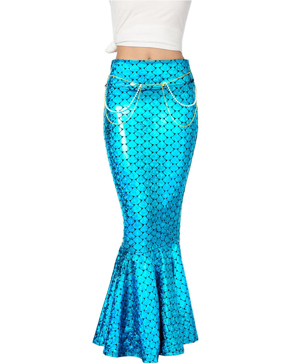 Splash through the waves in this Blue Metallic Hologram Shiny Mermaid Womens Skirt. This stunning skirt features a blue metallic hologram shiny design in the shape of a tail. The costume also comes with a gold chain with attached white pearls to either place around your waist or wrap around your wrist like a bracelet. Complete your mermaid look with accessories from our mermaid range.