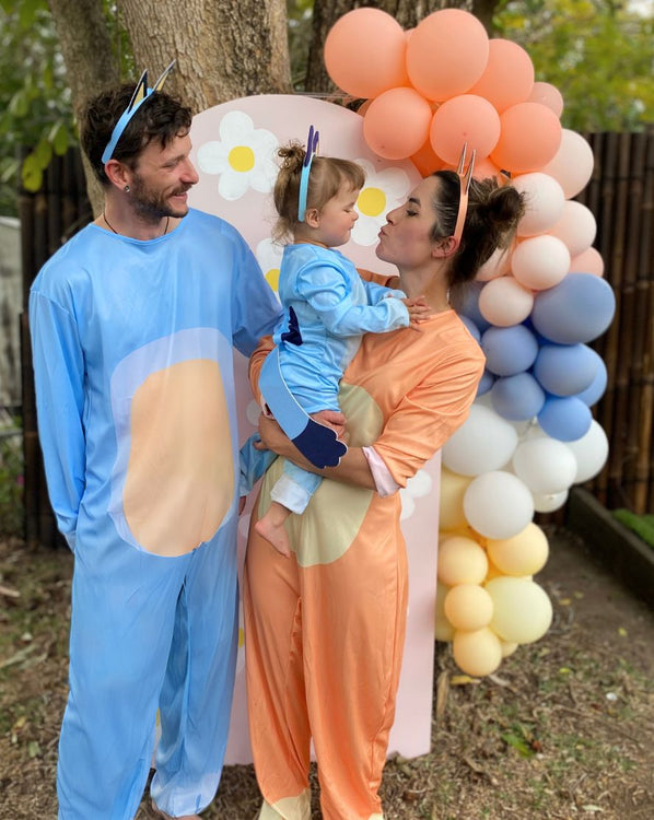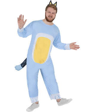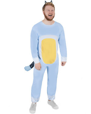 Join Chili and your daughters bluey and bingo wearing our Bandit Deluxe Adult Costume. Adapted from the fabulous Australian children's show Bluey staring Bluey, Bingo, Chilli, and Bandit. Featuring a blue bandit jumpsuit styled with light blue and yellow spots on the tummy, arms, and legs plus an attached plush tail with velcro closures at the back. The costume comes complete with a plastic headband attached with a pair of fabric ears!