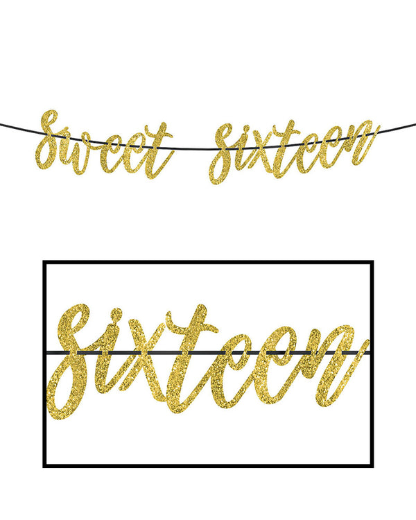 Decorate your special sweet 16 birthday party with elegant decorations that shine as bright as you starting with this Blush Gold Elegant Sweet Sixteen Glittered Ribbon Letter Banner. This stunning banner spells out 'Sweet Sixteen' in glitter gold with each letter attached to a black ribbon. Hang this banner in a spot for all to see and know it's your special day. Pair this banner up with our glitter gold party supplies for coordinated party look.