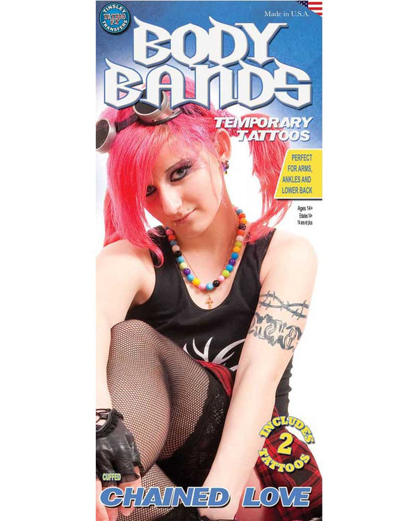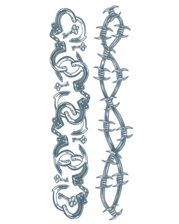 Complete your rocker or biker look with these Body Bands Chained Love Temporary Tattoos. These tattoos are perfect for arms, ankles and lower back and feature a barbed wire design tattoo and a handcuff and key design tattoo. Simply cut out the design you desire and apply with water.
