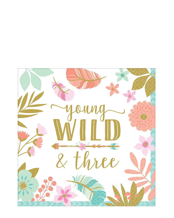 Boho Birthday Girl Young Wild and Three Lunch Napkins Pack of 16