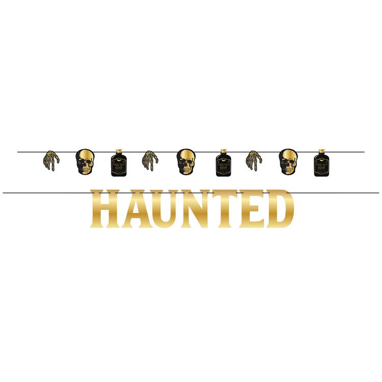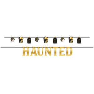 Complete your Halloween look with this Boneyard Glam Foil Banner Pack of 2 that's perfect for your Halloween party. The set comes with two banners that can be hung up together or separately with the included ribbon. One banner features gold foil paper letters that read "Haunted" and the other banner features a row of foil paper cutouts in the shape of skeleton hands, skulls and potion bottles. Combine with our range of Boneyard party supplies including party cups, party plates, serving bowls and more.