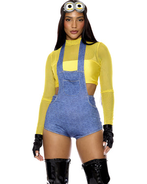 Get ready to bring the mischief with our Boo Yah Womens Costume. This playful outfit includes a yellow mock neck long sleeve crop top with sheer mesh panels. The blue halter neck romper is designed to look like overalls, with a cheeky cut at the back. Complete with short black fingerless gloves and a headband featuring attached silver goggles 'eyes,'. Inspired by the popular, Minion characters. Prepare for a night of fun and laughter as the hilarious yellow round fellas with cheek personalities.