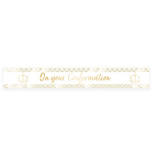 Make a statement with our Botanical Celebration On your Confirmation Foil Banner 2.7m. Measuring 2.7m, this white banner with gold detail showcases two crosses with 'On your Confirmation' in the center. It's a friendly and impactful way to enhance the visual appeal of your confirmation celebration. Combine with our range of Botanical Celebration party supplies including plates, napkins, tablecovers and more.