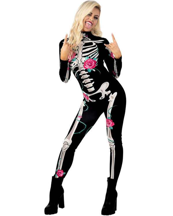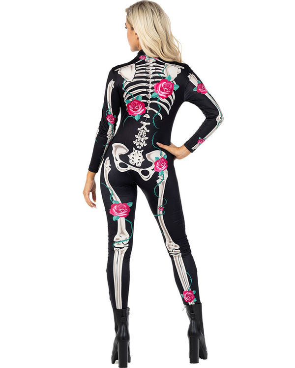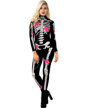 You can be both comfortable and cute this Halloween in this Botanical Skeleton Bodysuit Womens Costume. The costume includes a black high neck Morphsuit with skeleton bone print as well as pink flowers scattered throughout. The Morphsuit zips up at the rear.
