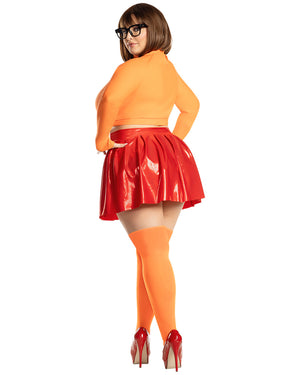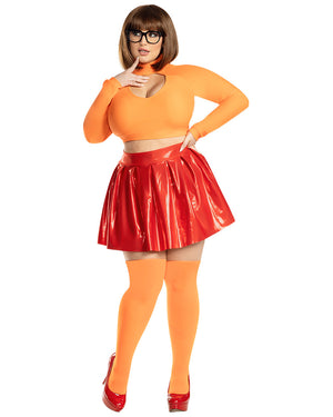 Channel your inner intelligent mystery-solver with this Brainy Babe Plus Size Womens Costume. This daring twist on a classic features a cropped orange long-sleeve top with a playful keyhole cutout, paired with a flirty red wet-look pleated mini skirt. Complete the look with the included bold black costume glasses and get ready to solve mysteries in style. Sexy, smart, and a little mysterious—you’ll turn heads while cracking every case. Perfect for Halloween, dressing as Velma for a Scooby Doo themed event or great for a group costume.