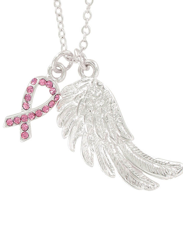 Show your support for a worthy cause with this Breast Cancer Awareness Angel Wish Necklace. Breast Cancer Awareness Angel Wish Necklace has a pink rhinestone ribbon charm and a silver angel wing charm on a silver tone chain. Necklace measures approximately 17.5" long.