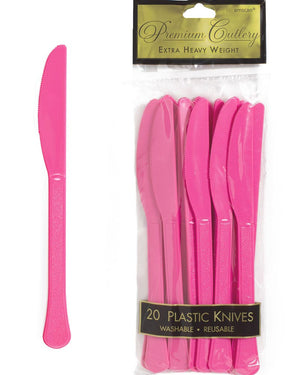 Cut through the stress of finding enough cutlery for all your guests at your next party with these Bright Pink Plastic Knives. The pack contains 20 heavy weight plastic knives that can be washed and reused.