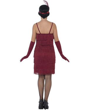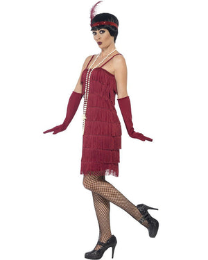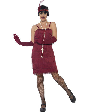 Dance the night away at a speak easy wearing our Burgundy Red Flapper Womens Costume. Featuring a burgundy layered fringed dress, inaddition to a pair of elbow-length gloves and a sequined headband with an attached feather. Complete the look with fishnet stockings, black shoes, bob wig, and beaded necklace.