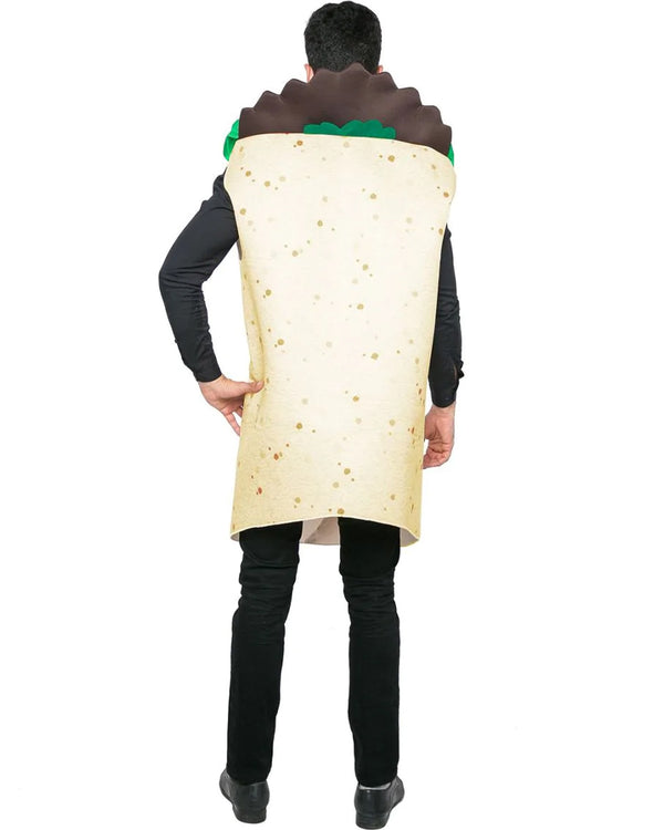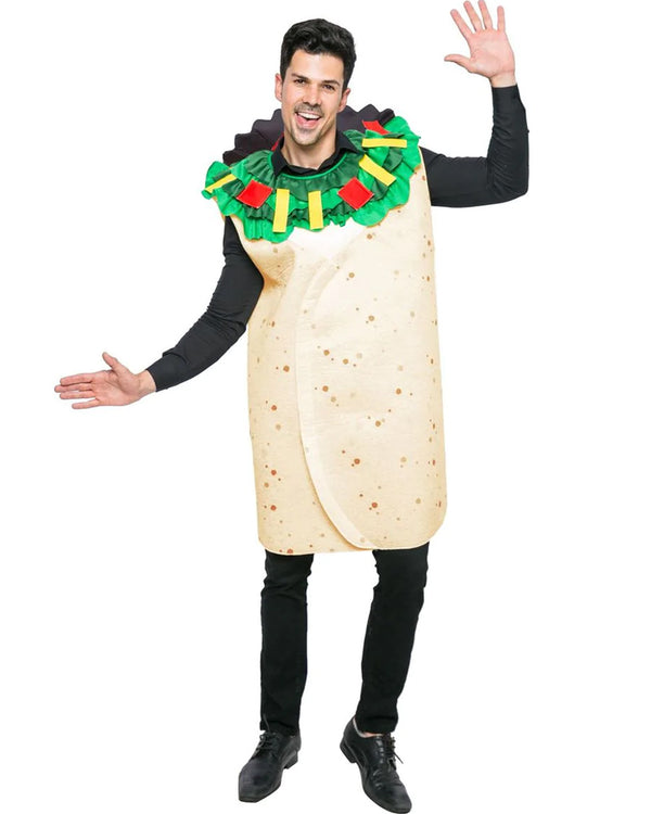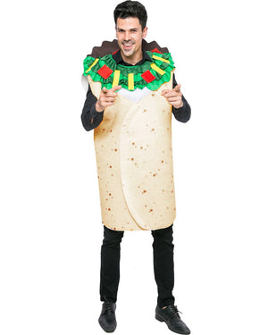 Wrap up your costume choice for the party, your decision's made with this scrumptious Burrito Adult Costume. The costume features a tunic in the shape and design of a burrito with a digitally printed tortilla wrap and appliqued ruffles and patches around the neck to look like lettuce, tomato and cheese coming out the top. The tunic is worn over the head and features a neck hole, holes at the shoulders and an open bottom for your legs. Wear your own clothing underneath for an easy choice of costume you can use time and again. Perfect for food-themed parties, funny costumes or even Mexican themed parties.