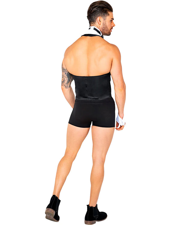 You'll be the centre of attention with our Butler Beefcake Mens Costume. Featuring a black sleeveless satin vest with attached buttons and white lapels. In addition to a white collar with an attached black bowtie, a pair of white cuffs, and black trunks with a white front and buttoned detail at the crotch.