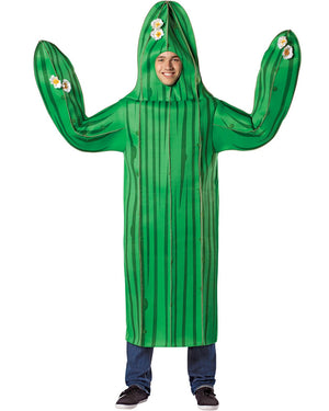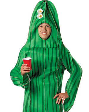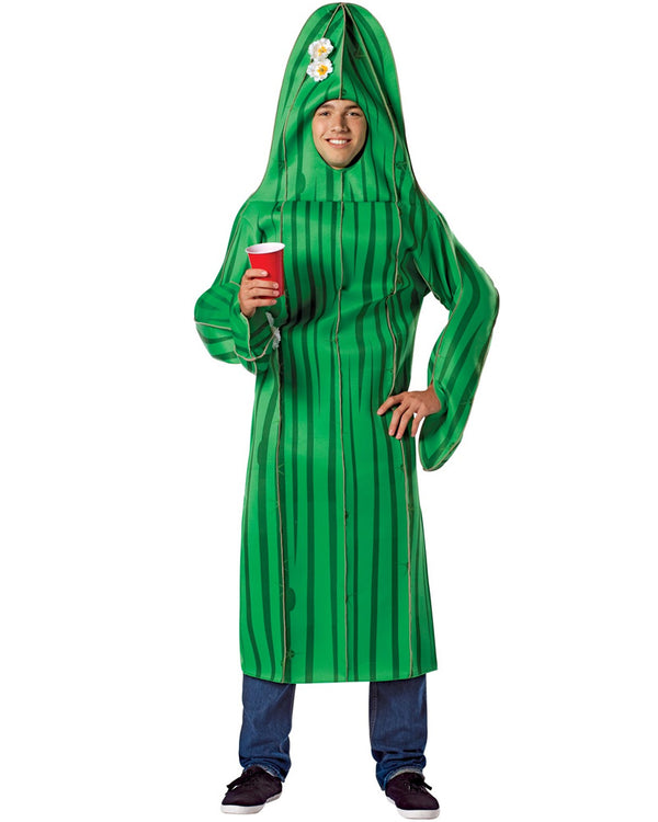 This Halloween dress up as a Cactus with our Cactus Adult Costume. The hilarious costume idea features a dark green striped cactus tunic with long sleeves and a hood with white and yellow daisy accents.