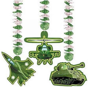 Celebrate your birthday military style with these Camouflage Dangling Cutouts. These cutouts are in the shapes of an army tank, military plane and helicopter hanging from a khaki green swirl. Combine with other products from our Camouflage party supplies range for a coordinated look.