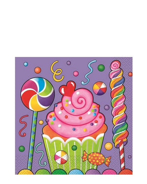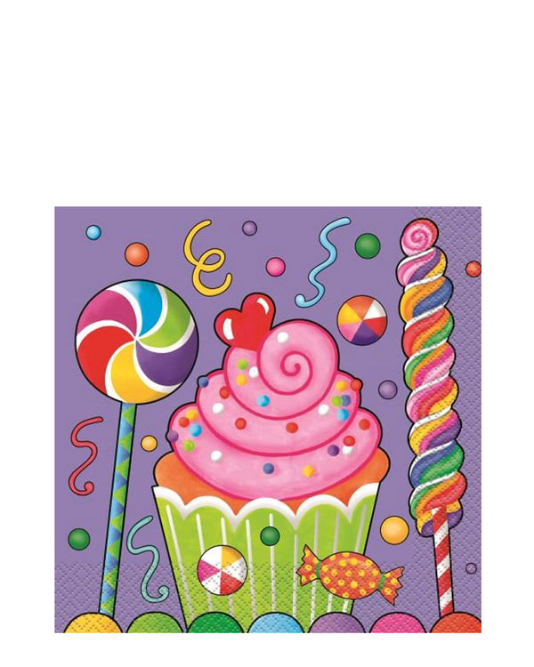 Ensure you keep mess and spills at bay when you and your guests are eating candy...uh, we mean lunch with these Candy Party 2ply Lunch Napkins Pack of 16. Hand these out to guests while they are having lunch or set them around your table setting with the rest of your tableware. The napkins are purple and feature a colourful cupcake in the centre surrounded by multi-coloured lollipops, lollies and confetti! For a sweet time, combine with our range of Candy party supplies including party cups, party plates, tablecovers and more.