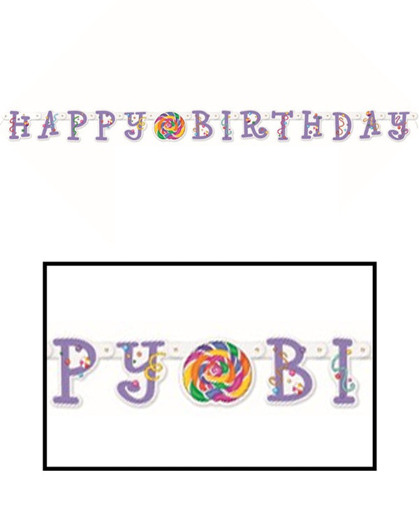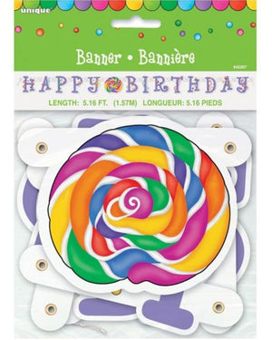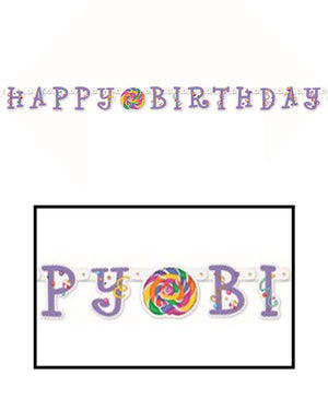 Show your with this Candy Party Happy Birthday Banner 1.5m and string her up across an archway, wall or roof at your home or venue! The banner is jointed and spells "Happy Birthday" in purple letters with a swirly rainbow lollipop head in the centre of both words. For a sweet time, combine with our range of Candy party supplies including party cups, party plates, tablecovers and more.