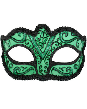 Fasten this Capri Green Masquerade Mask around your face to complete your burlesque costume or to look beautiful at your next masquerade costume ball. This mask is made from hard moulded plastic, edged in black braid and decorated with a black and green glitter filigree pattern. Ties up at the back with black satin ribbons.