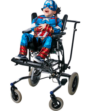 Let your child release their inner superhero in this wheelchair friendly Captain America Adaptive Boys Costume. The costume includes a Captain America costume top with digitally printed front and back bodice featuring fibre filled padding and a discreet accessibility opening in the fabric beneath. There is also a pair of digitally printed pants with rear opening with velcro tabs, allowing the pants to be put on from a seated position. To complete the look, also included us a foam backed mask with trademark 'A' on the front.