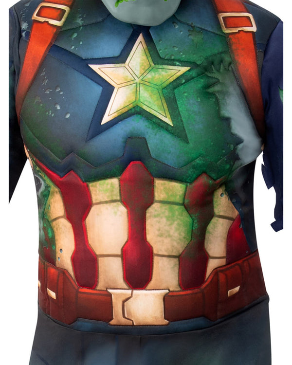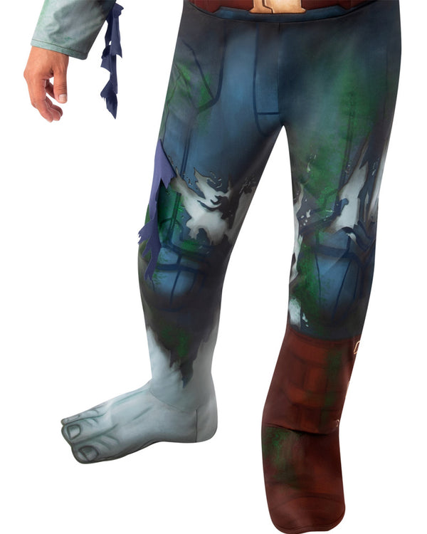 Travel to a Marvel Universe where zombies are taking over, including Captain America, which you can dress as in this Captain America Zombie Deluxe Teen Costume. This costume is based on the tv series What if? on Disney Plus. Costume features a digitally printed jumpsuit of Captain America's blue, red and white suit with zombie like ripping elements and splatters of green slime. There is foam-filled padding in the sleeves and shoulders. On the legs, there are attached foam padded boot covers with one as a boot and the other as a pale zombie foot. There is an included half mask of a zombie pale blue face with green slime around the mouth, still wearing the Captain America blue helmet.