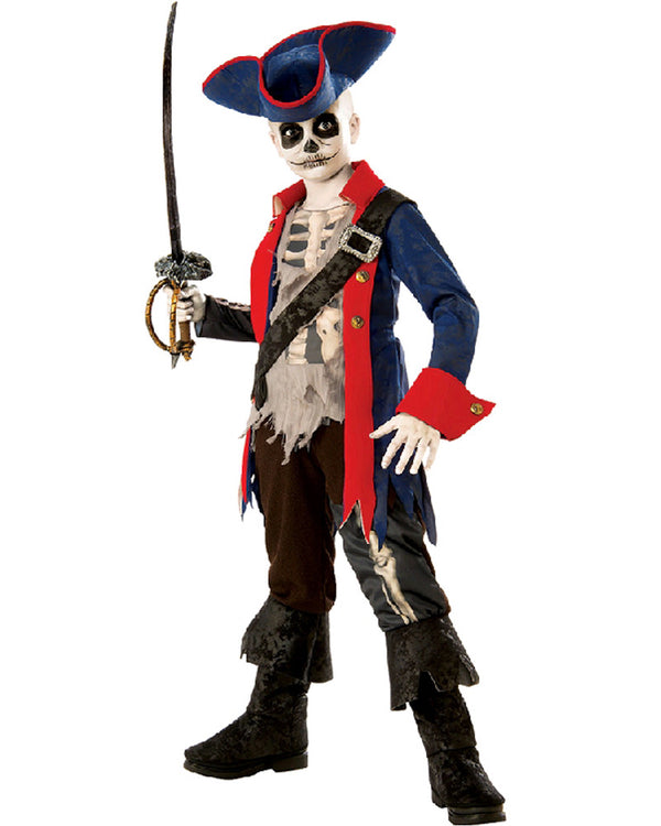 Join Barbossa's crew of cursed pirates with our Captain Bones Pirate Boys Costume. Become a fearsome pirate a fantastic costume for your little one to finish up there Book week or Halloween. The costume features, a stylised ripped skeletal top with an attached blue and red jacket with mock gold buttons and a large cuffs, also included are a sash with a mock gold buckle and trousers with one side featuring a digital print of the leg bones and brown bootcovers. You better watch out your child may make you walk the plank!