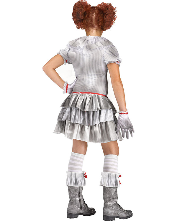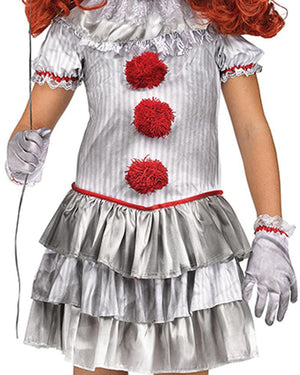 Run away and join the circus in our Carnevil Clown Girls Costume. The costume is adapted from the demonic clown from IT that haunts the losers club! Featuring a white dress decorated with red pom poms, a ruffled collar, a red trim on the hem of the bodice and sleeves plus a layered skirt! Complete with matching gloves white and grey striped knee highs and a ruffled pair of boot cuffs with a red bow tie! Great for your little ones trick or treating this Halloween!