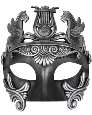 Wear this Cavalli Centurion Black and Silver Eye Mask to a masquerade ball or as part of a gladiator/Roman dress up look. Made from moulded plastic and decorated with a pattern of winged horses, scrolls and with a chariot feature in the centre. Secures with a black satin ribbon.