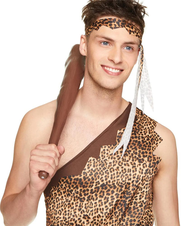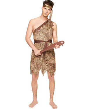 Unleash your primal party instincts with our Cave Man Mens Costume. This costume includes a one shoulder leopard print tunic with brown edging along the neckline. The tunic sits just above the knees and features a jagged hem. Attached around the waist is a brown waist sash. The perfect accessory, for a cave-dweller, is an included headband. Complete the Neanderthal look with accessories from our prehistoric range.