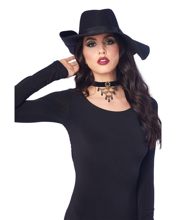 Bring a gothic edge to your look with this Chandelier Choker. Included is a black fabric choker with a centre gemstone and intricate gold metal hanging chain details in a chandelier style. Seven faux black gemstones hang from the chandelier chains, creating a V-shape. The perfect finishing touch to a dark yet regal dress-up.