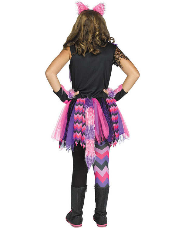 Transform into Wonderland's crazy, colourful cat with this Cheshire Cat Tween Girls Costume! This costume is styled as the Cheshire Cat from the 2010 adventure film Alice in Wonderland and features a black, pink and purple dress with an attached tail and fur, a headband with matching ears, a pair of matching mitts and footless tights. Perfect for Alice in Wonderland themed parties and Book Week.