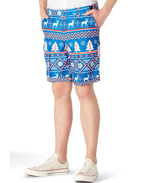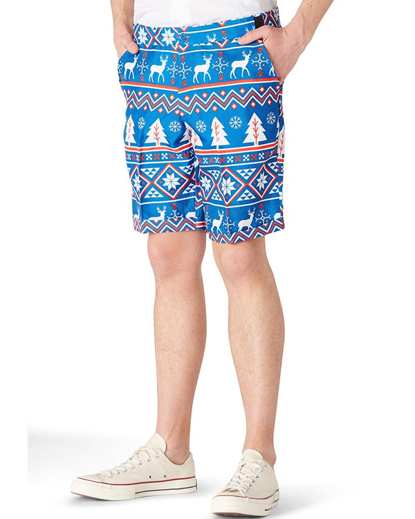 Don't let the hot weather during Christmas stop you from dressing sophisticated in the Christmas Blue Nordic Summer Suitmeister. The suit comes with a matching jacket, shorts and tie in colours of blue, red and white. Printed on the suit is an array of Christmas white icons including reindeer, snowflakes and Christmas trees. The jacket features two faux pockets on the outside and comes with a working inside pocket and the shorts features two front pockets and one back pocket. If you’re unsure about sizes we recommend picking the larger size of the two suits as they come in a slim fit. All Opposuit pants and jackets are lined with a small amount of additional fabric so that if desired, they may be tailored to your exact length and fit by an alterations business or tailor. The waistband includes elastic to allow for automatic adjusting to suit the wearer.
