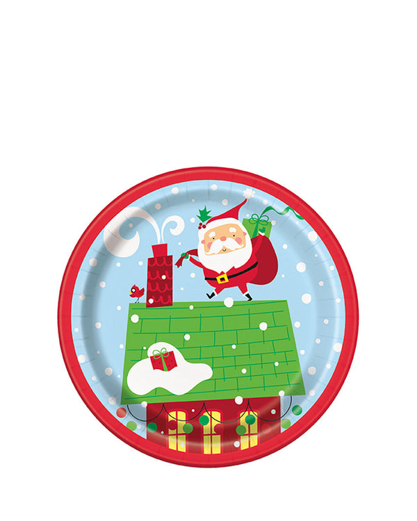 Set the table this Christmas with these Colourful Santa 17cm Plates Pack of 8. The plates feature a blue background with an image of Santa on the roof of a house with a sack full of presents.