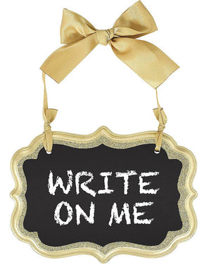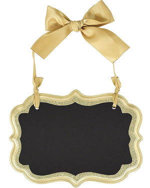 You can add a cute vintage look to your party with this Gold Glitter and Bow Small Chalkboard Sign. The sign is made from medium-density fibreboard with a vintage-shaped curved border in gold glitter. For easy hanging, there is an attached satin ribbon with a detachable gold satin bow, so it's perfect for writing up your own message, writing table numbers or names and displaying at events like weddings, bridal showers, Christmas and more. Combine with our range of Chalkboard party supplies including party cups, party plates, tablecovers and more.