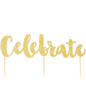 Add some sparkle to your cake with this gorgeous Gold Glitter Celebrate Cake Topper. This cake topper is made of high quality thick glitter paper stock and is perfect for celebrating special occasions like birthdays, engagements, weddings, anniversaries and more.