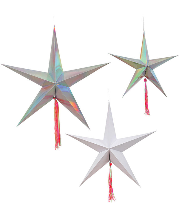 Create your own luck this Christmas by adding these Iridescent Star Hanging Decorations to your Christmas decor! These hanging stars are iridescent and feature silver foil embellishments and colourful tassels. Match with other products from our Christmas party supplies range for a coordinated festive look.