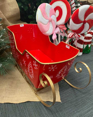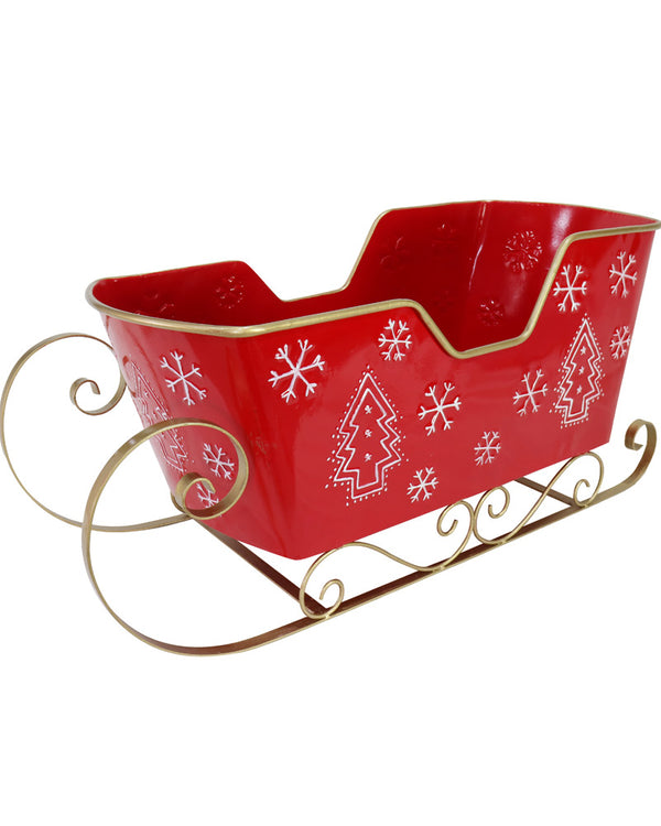 Make sure your Xmas decor absolutely sleighs with this Metal Red Sleigh Embossed 76cm. The sleigh decoration comes in red with white Christmas images painted along the outside. Along the top is gold edging, that matches with gold base. Use the sleigh as part of your Christmas decoration set-up or fill it with smaller gifts or treats for your Christmas celebrations. Combine with our range of Christmas party supplies including tree ornaments, props, decorations and more.
