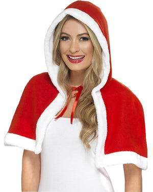 Complete your Christmas look with the Miss Claus Hooded Womens Mini Cape. The cape is red with white fluffy trimming on the edges. It reaches roughly half arm length with a hood and a little red ribbon tie around the neck to keep it in place. The perfect accessory to keep you warm and looking cute!