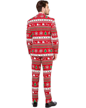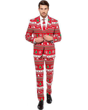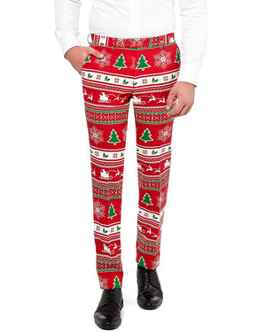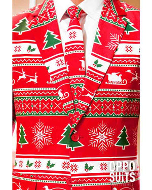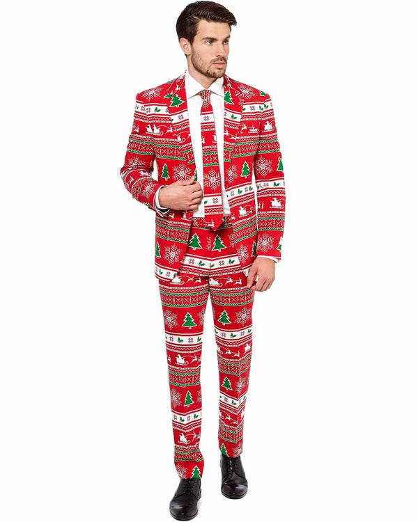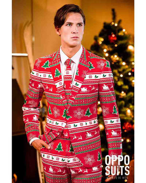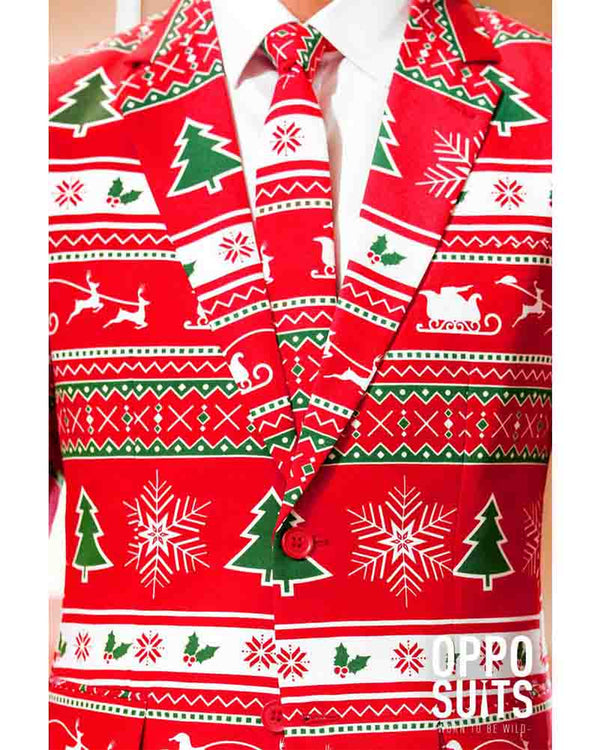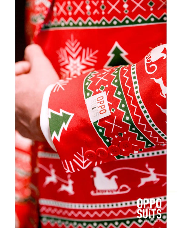 Want a white Christmas? Live in Australia? Never mind, at least now you can pretend with this Opposuit Winter Wonderland Premium Mens Suit! This Opposuit features a jacket, tie and pants all printed in a red Christmas pattern complete with Santa on his sleigh, Christmas trees and reindeers. Perfect at a work Christmas party or Christmas with the folks. This suit is made from high-quality material and is designed to fit, look and feel like a regular suit, only more stylish. Simply add your own shirt and you're good to go!