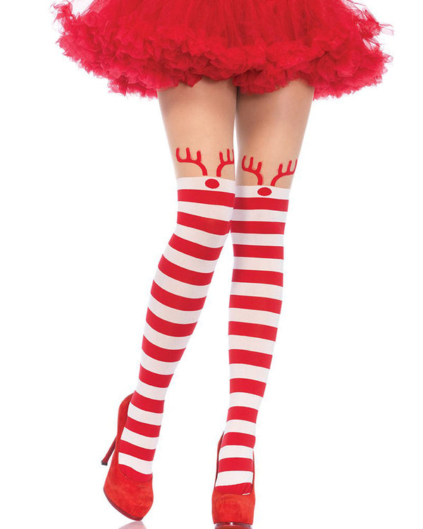 You'll really feel Christmas spirit this year in these Rudolph Reindeer Striped Pantyhose. The pantyhose are horizontally striped white and red from the foot to the knee where there are red antlers and a red nose. Above the knee the pantyhose are tan.