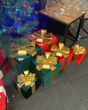 This Velvet Presents Green and Gold 3 Piece is a fusion of classic and modern to enhance your festive time. These present decorations come in a pack of three and are covered in a warm dark green velvet material with gold ribbon wrapped around the outside. Adorning the top of the presents is a large gold bow. Elevate your home decor and create unforgettable memories of Christmas with this set of presents. Combine with our range of festive party supplies to make your jolliest time of the year, cherished.