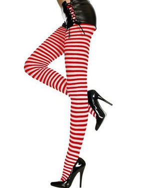 Show your stripes with the White and Red Striped Tights. These are full length, lightweight tights which feature a bright white and red stripe design. These will perfectly compliment costumes such as candy cane, Christmas elf, nautical and red, white and blue.
